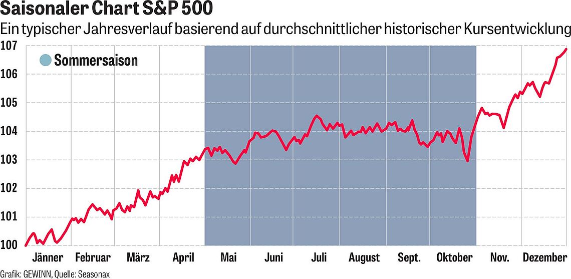 Die Experten von Seasonax, einem Fintech, das sich auf die saisonale Analyse von Finanzanlagen spezialisiert hat, haben einen durchschnittlichen Jahresverlauf des S&P-500-Index berechnet und grafisch dargestellt. Auch dieser Chartverlauf beweist eindrucksvoll, dass im Sommer in der Regel an den Börsen kaum etwas zu holen ist (siehe Chart).