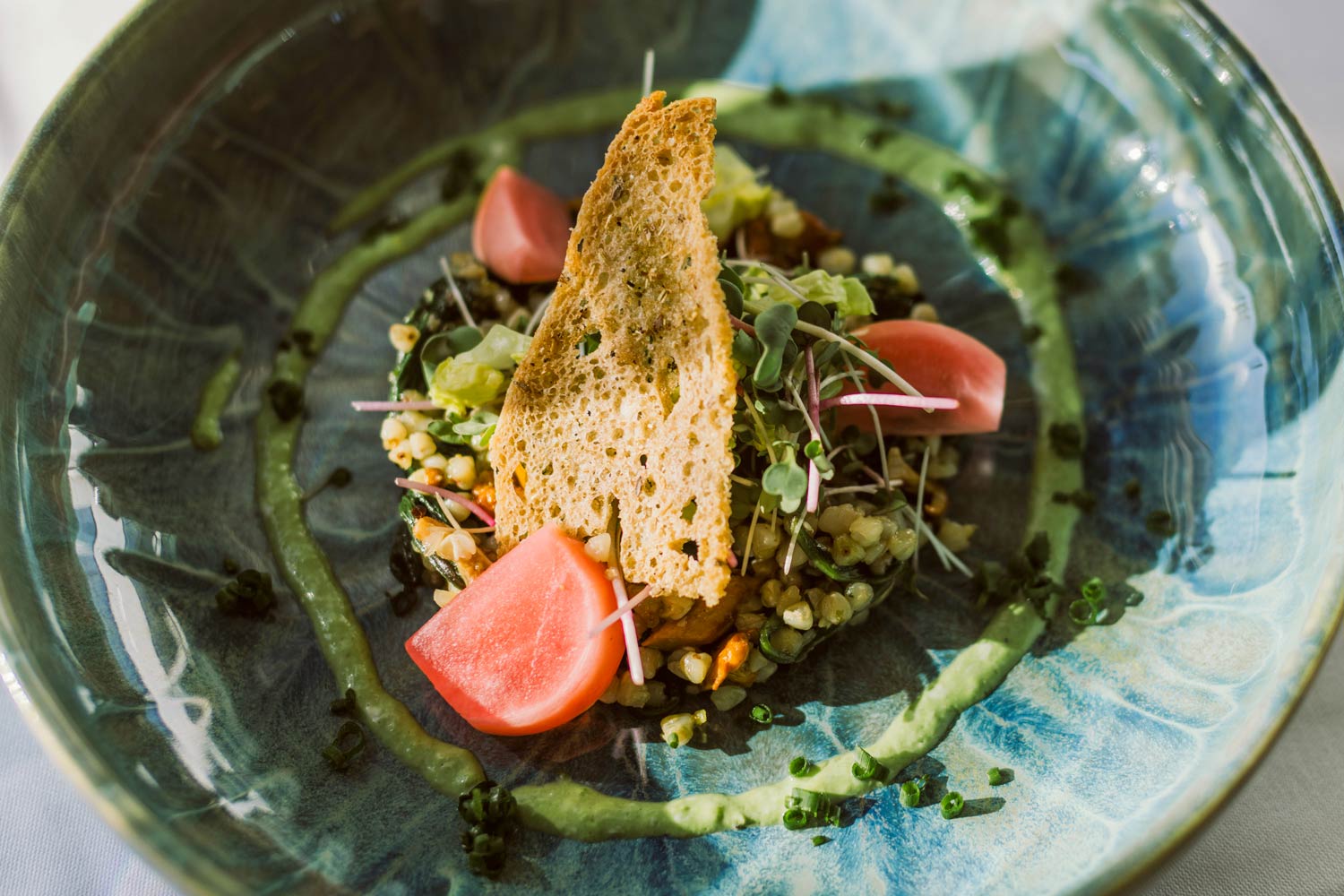 Dazu eine Weinauswahl, die auch Weine abseits des Mainstreams beinhaltet. Wer alkoholfreie Alternativen bevorzugt, für den gibt es Optionen wie Zitronengras-Ingwer-Limonade oder hausgemachten Kräutersirup aus Melisse, Verbene und Minze.