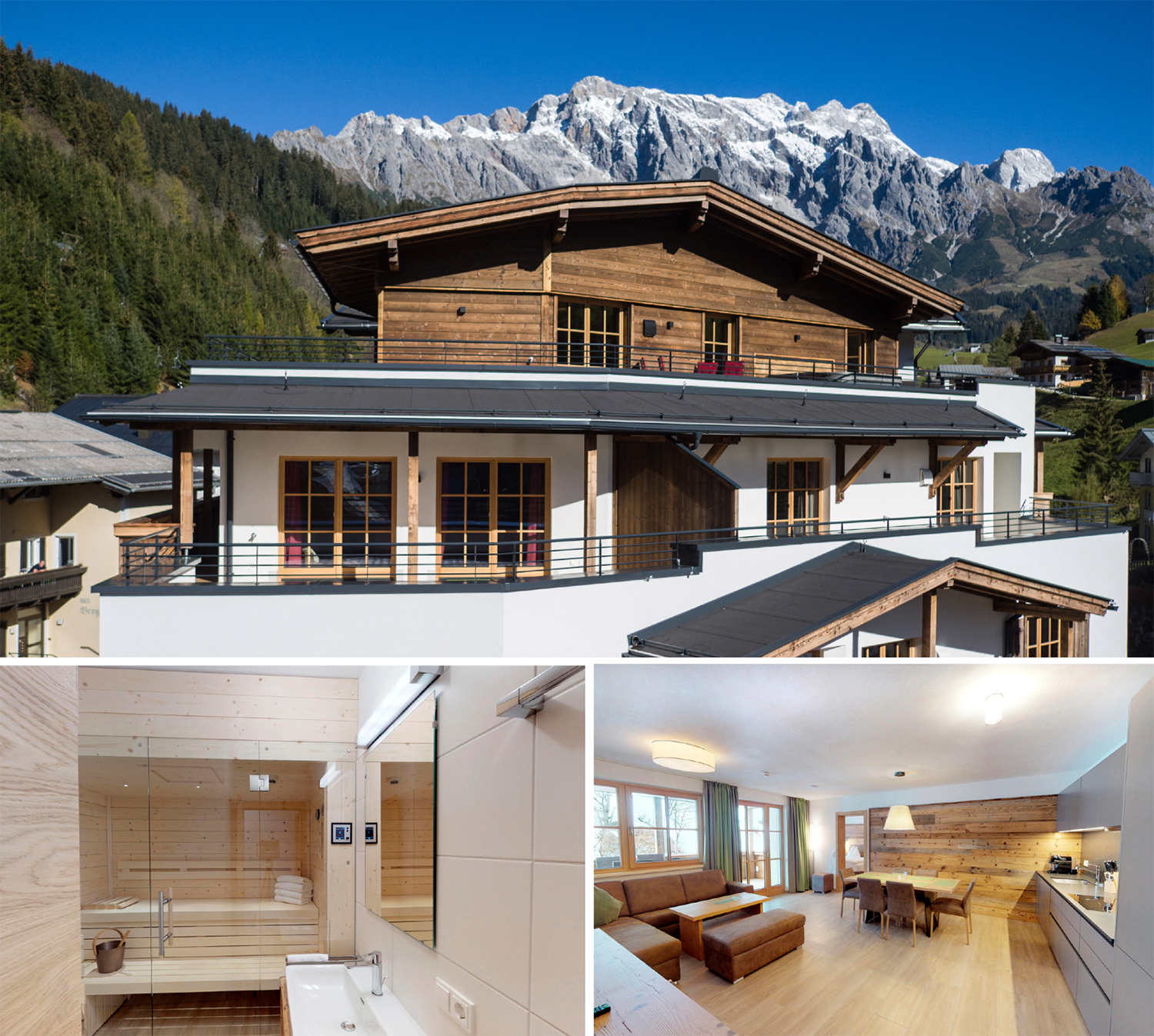 Das Apartment eignet sich für bis zu 6 Personen und verfügt über eine exklusive Ausstattung. Balkon mit Bergblick, Sitzbereich, Essbereich, voll ausgestattete Küche, 2 Schlafzimmer, 2 Bäder, Sauna.
