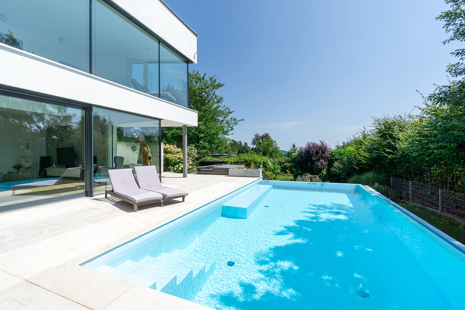 HWB 46,2. Luxuriös ausgestattet mit mediterranem Flair, offenes und helles Wohnkonzept, Sauna, Süd-Terrasse mit Infinity-Pool, Weinkeller, Dachterrasse, Doppelgarage, absolute Ruhelage